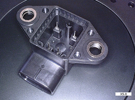車載電装部品のコネクタなど、立体的かつ複雑な形状を持つ複合成形品の外観検査は、多様なアングルからの観察が必要となります。