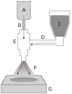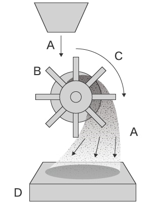 羽根車(インペラー)をモーターで回転し、遠心力で投射材を飛ばします。コンプレッサーが必要無いため、省エネ・ローコストですが、加工力の調整が難しく、精度の高い加工が苦手です。