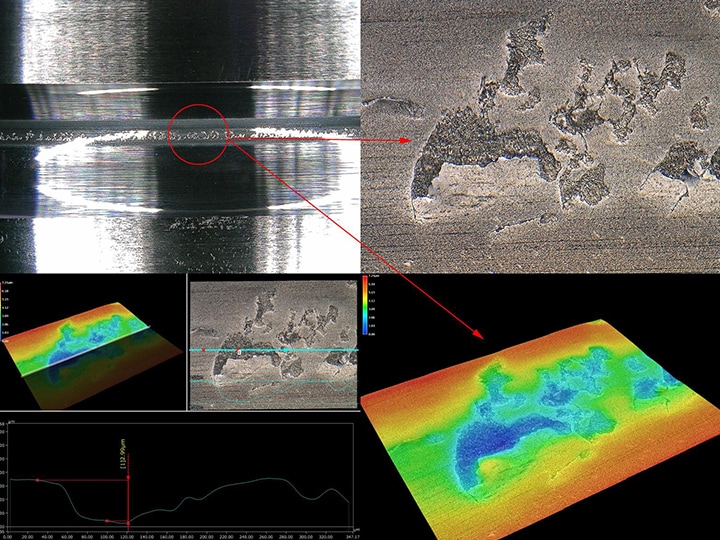 4Kデジタルマイクロスコープ「VHXシリーズ」は、鮮明な拡大・観察だけでなく、従来の顕微鏡では不可能だったさまざまな計測・測定、そして数値の取得が可能です。マウスによる簡単な操作で、摩耗試験後の摺動面のフレーキング*やピッチング*といった損傷の観察から粗さの検査に役立つ平面計測・粗さ測定まで、これ1台で手軽に実現します。