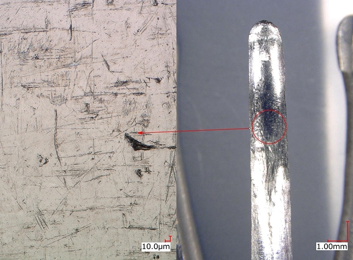 これにより、異物か打痕、またはピットかピンホールかを定量的に評価することができます。「VHXシリーズ」1台で、拡大観察から2D・3D測定まで効率的に行うことができます。