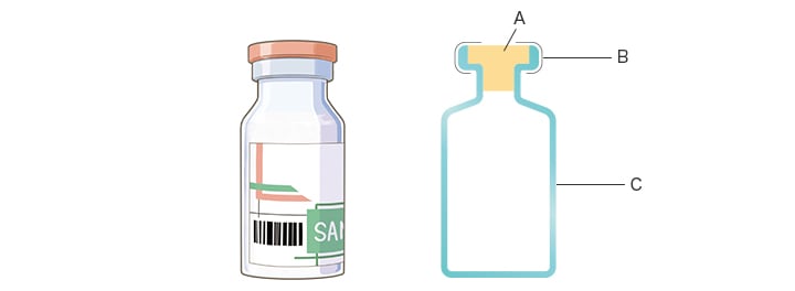 bottle)とは、注射剤などの保管に使用される容器です。広口の無菌ガラス容器に薬剤を充填後、開口部にゴム栓で打栓し、アルミニウムキャップなどでゴム栓と開口部を巻締めたものです。