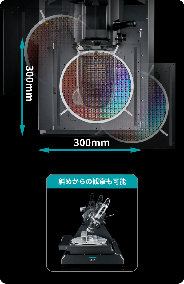 300mmx300mmの稼働範囲と耐荷重30kgの大型対応ステージの登場で広い領域の観察と測定を実現しました。また、フリーアングル観察によりウェハ端面など、斜めからの観察も行えます。