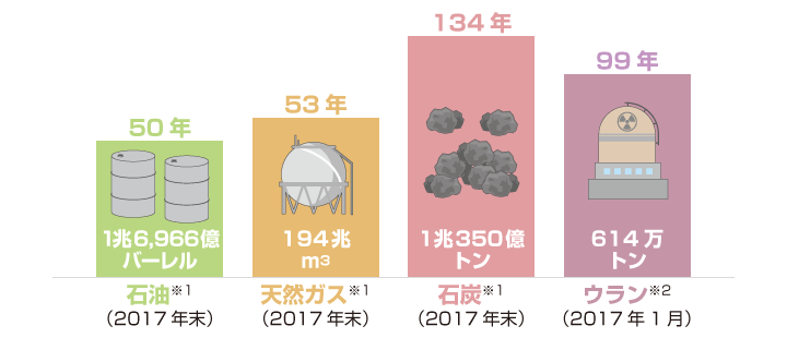 上述のようにエネルギー消費量の増加が予測されていますが、そのエネルギーは石油や石炭、天然ガスといった化石燃料に頼っているのが現状です。これら化石燃料を「あと何年間採掘できるのか」を示したものがエネルギー資源確認埋蔵量です。エネルギー資源確認埋蔵量とは、現時点で確認されている経済的、合理的な範囲で採掘可能なそれぞれの資源の埋蔵量を年間の生産量で割ったものです。世界のエネルギー資源確認埋蔵量は、石油や天然ガスが約50年、ウランが約100年、石炭が約130年で枯渇すると予測しています。