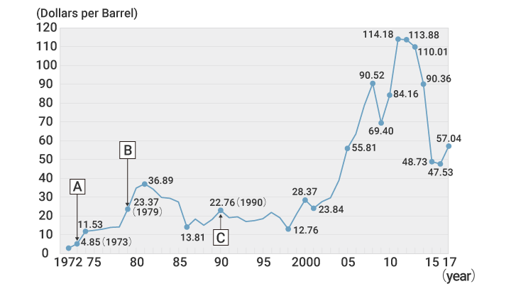 また原油価格は、需要と供給のバランスで価格が決まりますが、エネルギー消費量が増えれば高くなります。2000年以降は、中国やインドなどの新興国で石油需要が増大し、主要産油国である中東地域の政情不安、短期的な価格変動に着目した投機資金の流入などにより、原油価格は大幅に変動しています。原油価格をはじめとしたエネルギー資源の価格高騰は、企業経営にも影響し、収益悪化などの要因になります。