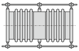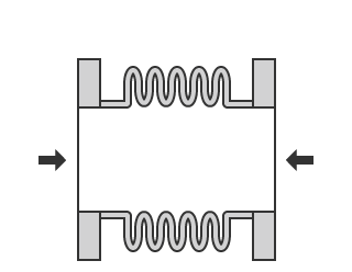 ベローズ型伸縮継手には単式と複式があり、単式は1つのベローズで主に軸方向と角度、軸方向に対して直角方向の変位に対応することができます。複式は単式を2個組み合わせたもので、軸方向と軸方向に対して直角方向の変位に対応することができます。角度の変位には対応できませんが、軸方向には単式より大きな変位に対応できます。