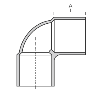 エルボーは管の進路を変える継手です。45°・90°・180°があり、これら継手の形状寸法は規格で定められています。それぞれにロングとショートがあり、ロングとは、曲げの半径が管の外径の約1.5倍です。また、ショートは曲げ半径が管の外径と同じ継手です。一般的に使われるのはロングで、狭いスペースの配管にはショートが使われます。