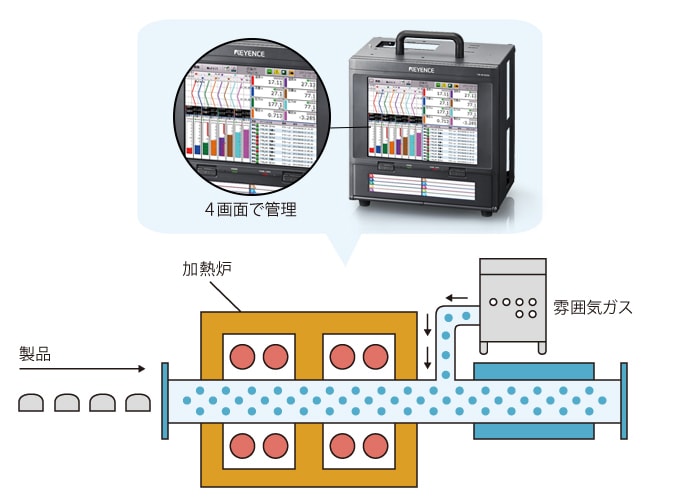 キーエンスのタッチ型パネルレコーダ「TR-Wシリーズ」は、炉内温度の波形と同時に各種温度や流量、圧力などを1台で収集・記録できます。もし不良が発生しても、そのときの炉内温度や冷却水の水温や流量、雰囲気ガスの流量を記録しているので、データ提出や解析がスムーズに実施できます。プリンタ搭載タッチ型パネルレコーダ「TR-Hシリーズ」であればリアルタイムでの打点はもちろん、必要なところをあとからチャート紙に打点できるので効率的です。