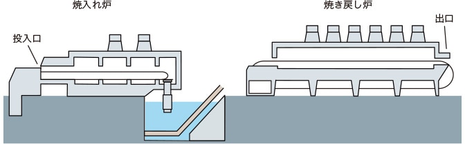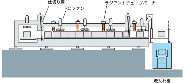 脱脂・昇温・浸炭・拡散・降温・油槽の各ゾーンを仕切り扉で分離したローラーハース搬送式炉が普及。各ゾーンを分離することで雰囲気炭素濃度と温度の制御が向上し、処理リードタイム短縮や品質安定化を達成しました。炉壁もそれまでのレンガから軽量で断熱性に優れたセラミックファイバーが用いられ、バーナー類も一新されたことで生産性・省エネ性もアップしています。熱処理炉の設計や材質にも進展が見られたのもこの頃です。