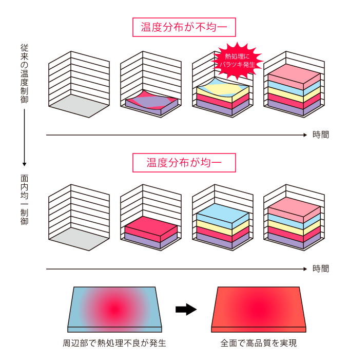 鉄鋼に熱処理を加える目的は、強度の確保や加工性の向上などが挙げられ、現代のものづくりにおいて欠かせない工程となっています。一方で熱処理は形状変化を伴わないので検査が難しく、品質管理には経験と知識はもちろん設備の運用管理の徹底が欠かせません。