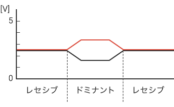 バスの状態 レセッシブ(1) ドミナント(0) Min. Typ. Max. Min. Typ. Max. CANH 2.00 2.50 3.00 2.75 3.50 4.50 CANL 2.00 2.50 3.00 0.50 1.50 2.25 電位差 -0.50 0.00 0.05 1.50 2.00 3.00