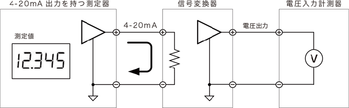 信号変換器を使用することで4-20mA出力を、電圧入力レンジを持つ計測器で計測できます。