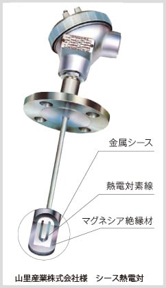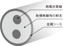 外気から遮断するため、金属の被覆と一対の熱電対素線の間に、粉末状の無機絶縁物を充填封入して加工した熱電対のことを、"シース型熱電対"といいます。