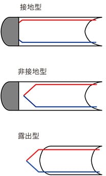 - 熱電対の素線をシースから露出し、測温接点を作ったシース熱電対です。応答性は3タイプの中では最も早く、わずかな温度変化も追従します。エンジンテストなど、早い応答性が求められる場合に使用します。ただ、強度は著しく低いので基本的には使い捨てで使用します。