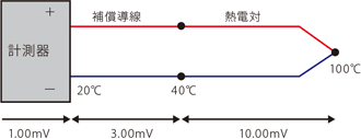 感温部は温度勾配がある部分ですので、補償導線においても、その温度差に相当する熱起電力が発生します。計測器では発生した熱起電力の合計値を演算し、温度として表示します。