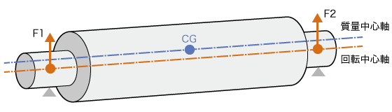 高速で回転する製品では、静釣合い試験→動釣合い試験→多面釣合い試験の順で試験を行い、試験で重心の偏りが判明した場合は、都度重心の補正を行います。釣合い試験の試験機にはさまざまな種類がありますが、一般に軸受型釣合い試験機が用いられます。