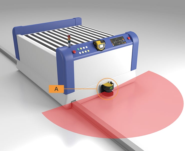 - RGVに、セーフティレーザスキャナを搭載します。セーフティレーザスキャナは絶えず進行方向を監視し、作業者を検知した場合、OSSDをOFFにします。