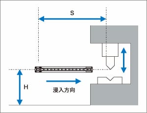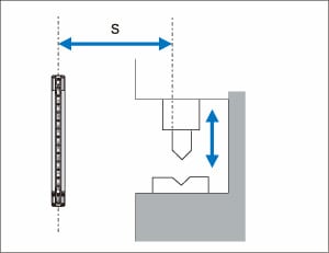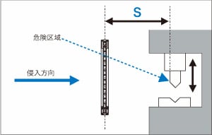 セーフティライトカーテンなどの電気的検知保護設備を設置する場合、人体が検出領域に侵入し、危険区域に到達する前に機械が停止するために必要な最小距離がISO13855等の規格により規定されています。ライトカーテンを設置する際には、使用する国または地域の規格、規制または法律等により定められる安全距離(最小距離)を必ず確保したうえで設置してください。