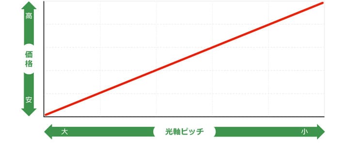 セーフティライトカーテンは、光軸間のピッチ(幅)によって価格が変わります。ピッチが小さいほど設備停止に対する応答性が向上し、安全距離も短くできます。