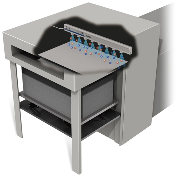 セル工程は作業上、どうしても静電気が発生します。アース対策や導電化などを行なっても、部品の剥離時の帯電や中空での作業時などは、それらの対策だけでは効果が不十分です。除電器を用いることで静電気対策効果を向上します。