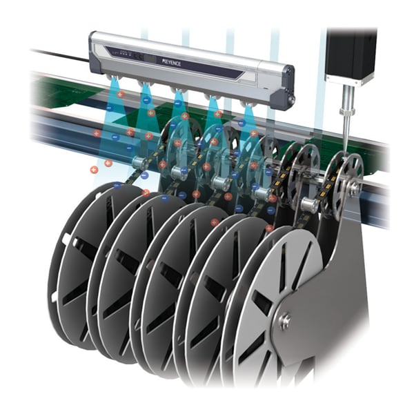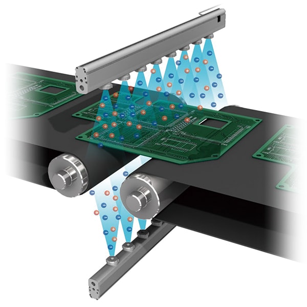 搬送部では基板とコンベアとの接触・剥離により基板が帯電します。大きな帯電は異物付着や静電破壊発生を引き起こし、製造不良へとつながります。除電器を用いることで帯電を除去し、製造不良を低減します。
