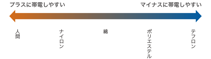 帯電列を見ると、どの材質がプラスに帯電しやすく、どの材質がマイナスに帯電しやすいのかを知ることができます。例えば、ナイロンはプラスに帯電しやすく、ポリエステルはマイナスに帯電しやすい材質です。ポリエステルとナイロンがぶつかった場合には、ナイロンはプラスに帯電し、ポリエステルはマイナスに帯電します。