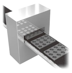 レンズ洗浄のあと、ケースに整列されて蒸着工程へ搬送されます。搬送途中で、空気中に浮遊する帯電したホコリなどのゴミが付着することがあります。帯電して付着したゴミはエアブローで除去しても再付着します。