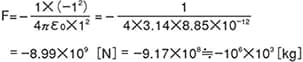 このクーロン力は、2つの電荷が同極性の場合は反発力、違う極性は吸引力となり、これを重力の加速度9.8[m/s2]で割ると[kg]になります。