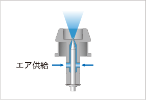電極針の形状は流体力学を応用することで、周囲のエアを巻き込み風量を増大させるため、世界最少のエア流量で、広範囲に対する高速除電を実現します。