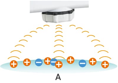 図の「A」の状態を静電気測定器で測定すると、プラスの静電気のほうがより多いため、測定結果は「プラス」になります。しかし、厳密にセンシングするとプラスだけでなく、マイナスに帯電している部分も混在していることがわかります。