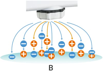 キーエンス独自の「I.C.C.方式」は、対象物の帯電状況を正確にセンシングし、図の「B」のように、帯電状況に最適なイオンを最適量作り出すよう自動制御(I.C.C.制御)することで、効率良く確実に対象物の静電気を中和することができます。