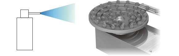 手軽に使うことができるので、製品ラックに置いた製品が帯電しないように吹きかけたり、パーツフィーダの横に置いて部品が詰まったときに吹きかけて詰まり解消に使用したりします。
