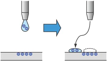 滴下する段階で、材料がマイナスに帯電しているとします。一方で、本来滴下すべき場所の周囲がプラスに帯電している場合、滴下した材料との間に引き合うクーロン力がはたらきます。クーロン力によって材料は引っぱられるため、狙った場所とは違うところに落ちてしまうのです。