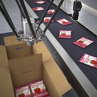 ライン上のお菓子の位置や角度をカメラで認識し、ハンドピースでピッキングして箱詰め作業を行うロボットです。正確なピック&プレースが得意なパラレルリンクロボットと画像処理システムを活用することで高速搬送を実現。汎用性の高いロボットのため、サイズや形状の異なる商品にも対応可能です。