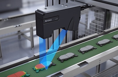 ブレーキパッドの打痕を全数検査します。インライン3次元検査では、外観不良の検査と同時に、高さや面積の測定も可能です。品種判別や寸法測定など複数の検査を同時に実施することで、検査の合理化が実現します。