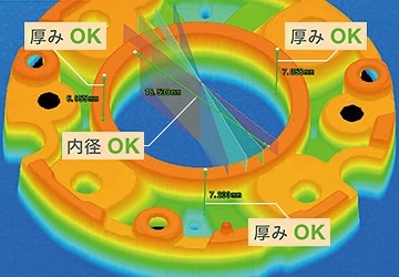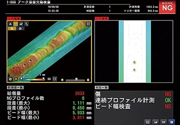 など複数の検査項目をビジュアル化できるほか、撮影画像・3Dグラフィック・数値・OK/NGなど複合的な情報を合成表示できます。検査目的やワークの特性に応じて処理・表示内容を設定できるため、多様な検査に対応可能です。