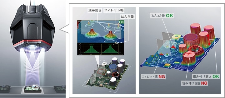 2次元・3次元の変位計やパターンプロジェクション照明など、さまざまな条件下で高速かつ高精度にデータ取得が可能なヘッドや照明と、高性能な「画像処理システム(コントローラ)」を組み合わせることで3次元画像処理が実現します。