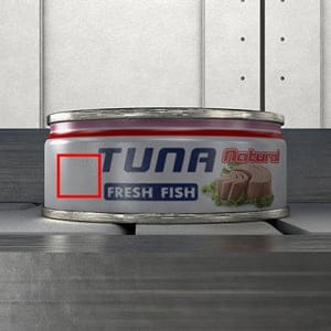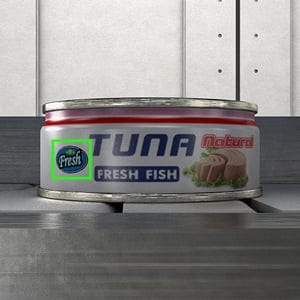 後工程での目視検査の代わりに、カメラで一定期間のみ貼付されるキャンペーンシールの有無検出を行います。