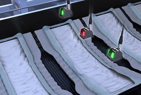 「反射型センサ」を用いる場合、検出するポイントの数だけセンサヘッドを取り付けなければならず、サイドギャザーの全面を検出することは不可能です。検出するポイントを決めても、段取り替えの際はすべてのセンサヘッドの取り付け位置と設定を変更しなければなりません。また、反射型センサは応答速度次第では、タクトタイムを落とさなければなりません。
