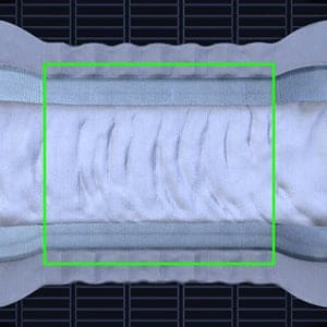 コンベア上で搬送されてくるおむつのサイドギャザーがめくれていないかどうかを検出します。