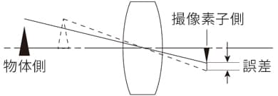 コンパクトサイズと高性能をバランス良く実現する、物体側テレセントリック方式を採用。この方式は小径レンズながら、ワーク側の主光線がレンズ光軸に対して平行なため、ワークの上下動やピントズレがあっても撮像サイズの変動が少なく、測定誤差がほとんど発生しません。