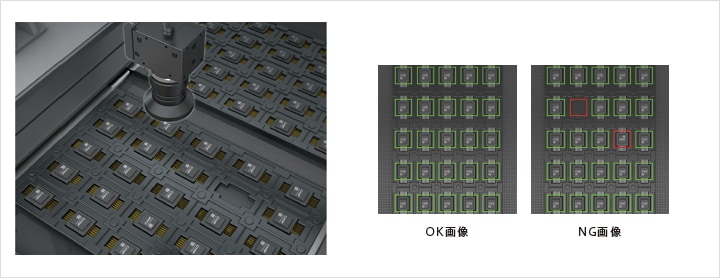 トレー上のICチップの有無検査と方向判別を画像センサで行います。