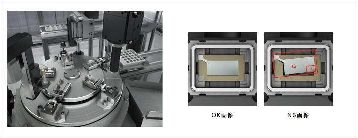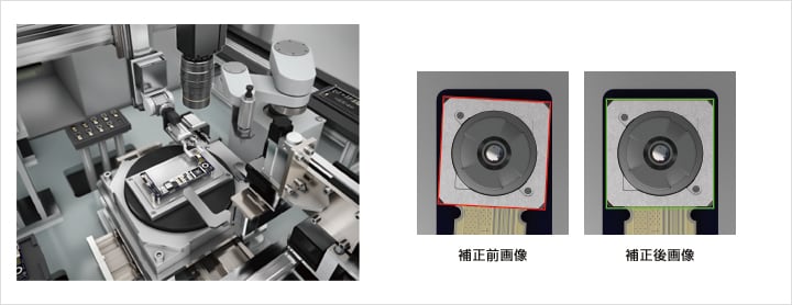 カメラモジュールの組み付けアライメントを画像センサで行います。