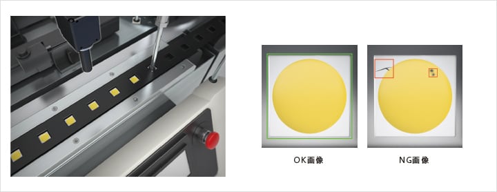 LED表面にある異物や欠けなどの欠陥を画像センサで検査します。