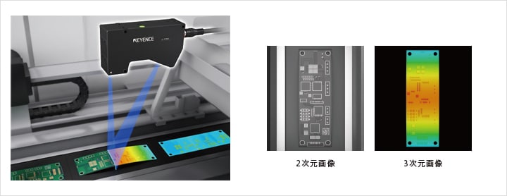 反りのような変形は画像センサで判別が困難でしたが、レーザ変位センサと画像処理システムを組み合わせることで、高さ情報をもとに基板の反りや実装部品の有無検査も実現します。