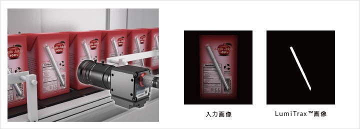 パックジュースのストロー有無検査は、背景形状や位置の変化により安定した検出が困難でした。「LumiTrax機能」を利用すれば、背景や位置のずれに影響を受けない安定検査が可能です。