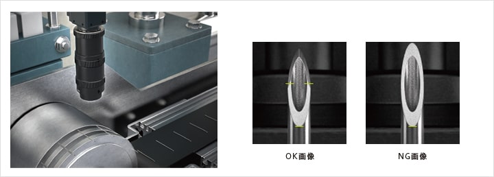 注射針の刃面の寸法を画像センサで検査します。