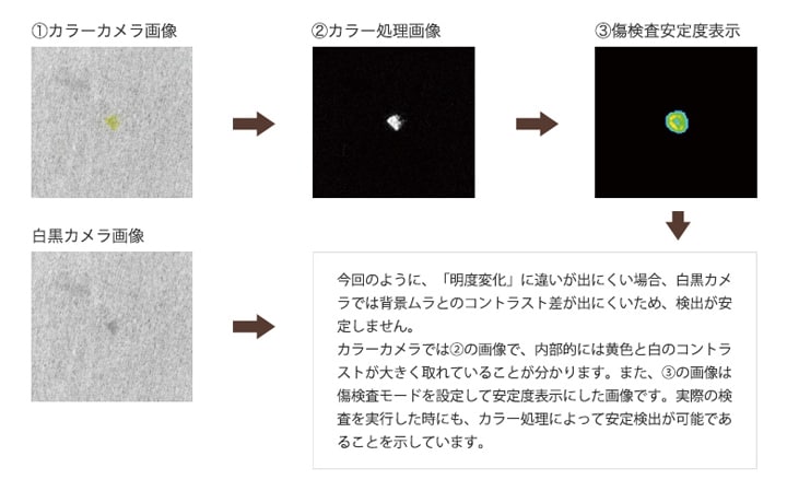 「カラーカメラと白黒カメラ、どちらを選定すればよいの?」という質問がよくあります。一般的に、検出したいポイントが「色相変化」で差が出ている場合はカラーカメラでメリットが出るケースがあります。以下は白黒カメラでは検出しづらい白地に黄色の汚れをカラー処理を使用して検出している例です。