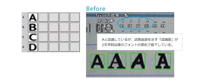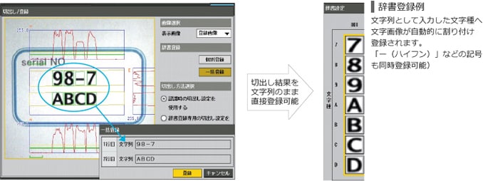 上記のように文字検査といっても様々ですが、その基本は撮像した画像から1文字ずつ切り出し、登録しておいた辞書と比較して文字を認識することです。