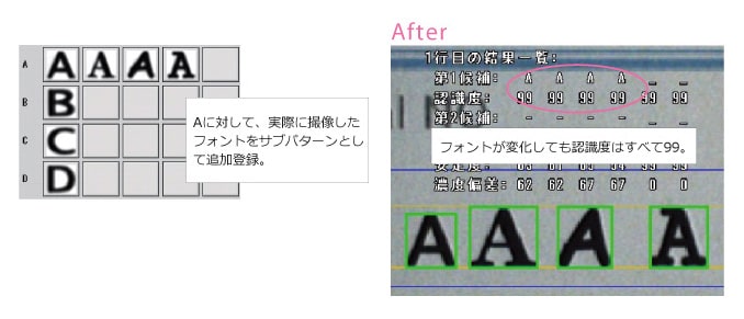 1文字に対して複数のパターンを登録しておくことで認識安定度が向上します。サブパターンとして各種フォントを登録しておくことで、フォント違いによる認識ミスを防止することも可能です。