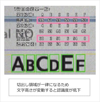 文字を切り出す際、自動で最適な切り出し状態に微調整する処理を「自動フィッティング」と呼びます。文字毎の微妙な変化を補正してから照合するので認識度が上がります。